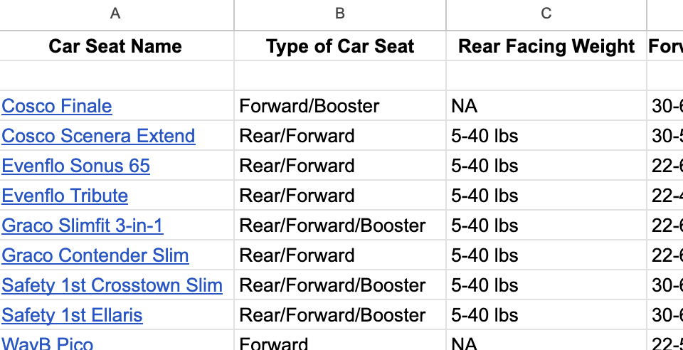 Drop your email below to get access to the FREE car seats spreadsheet! Once you hit "submit" you'll be directed to the spreadsheets!